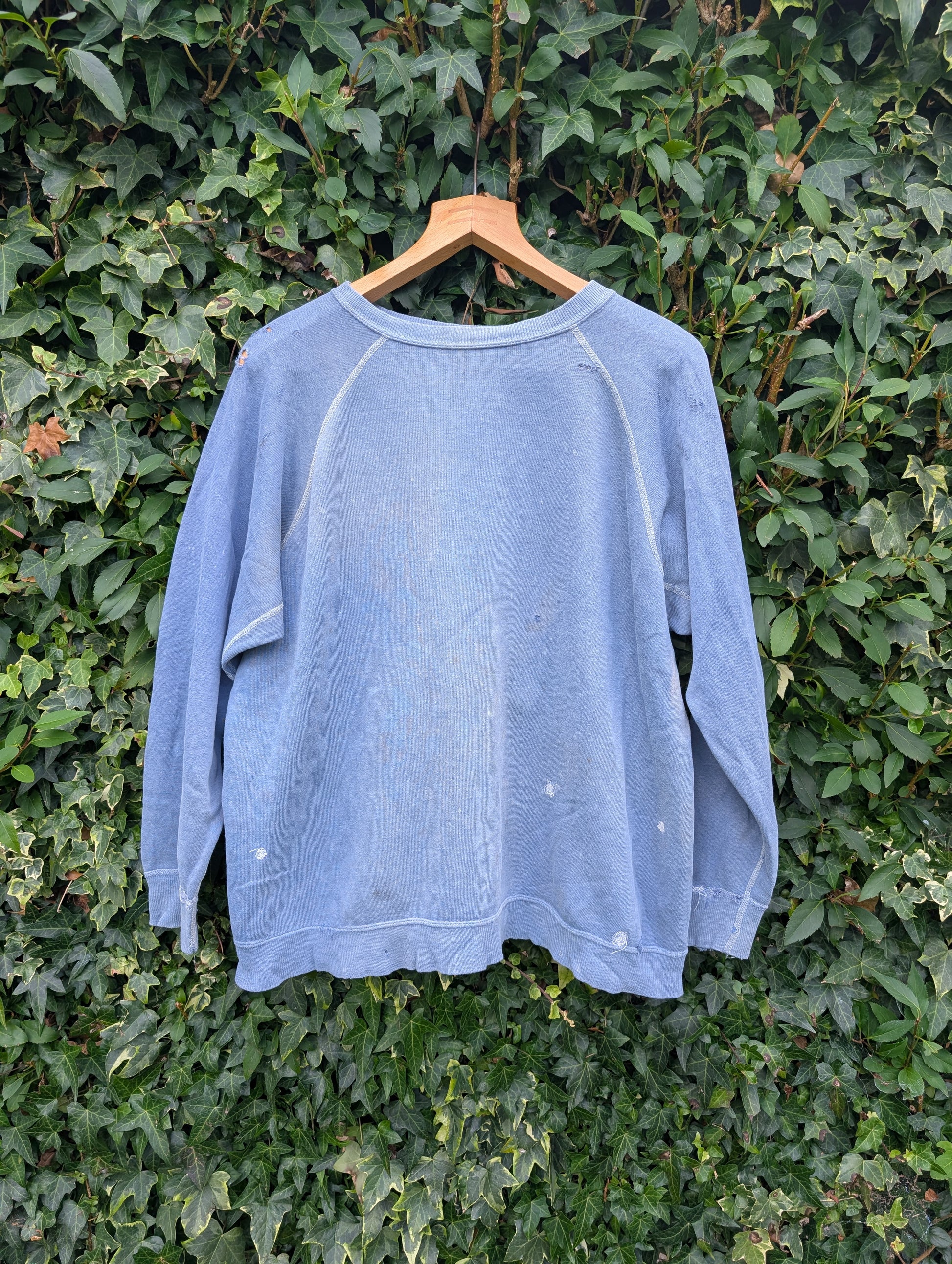 This 1940's sweatshirt exudes a unique charm with its original patina and distressed appearance. Crafted with quality, it showcases authentic wear and tear for a beautiful vintage appeal. Perfect for collectors and fashion enthusiasts alike, this large sweatshirt is a must-have piece for any wardrobe.