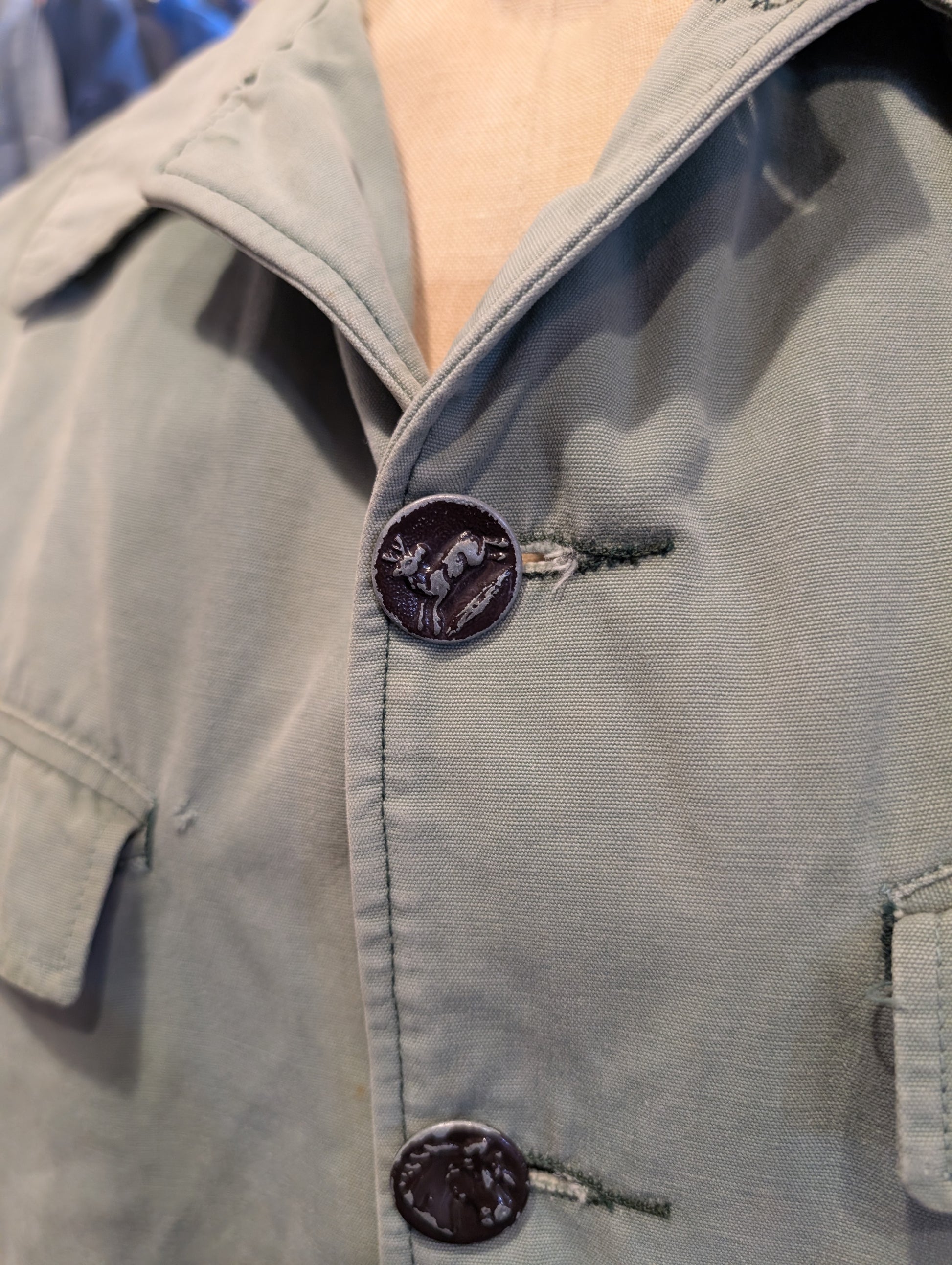 This vintage 1950s French hunting jacket is a must-have for any outdoorsman. The faded green color adds a touch of ruggedness, while the size large and 22 inch pit-to-pit measurement ensure a comfortable and roomy fit. With its timeless design and durable construction, this jacket is perfect for any hunting or outdoor adventure.