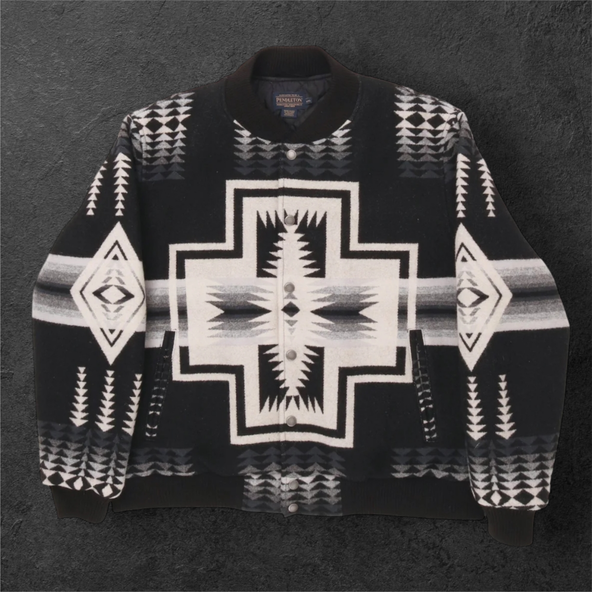 The Pendleton 'Gorge' wool bomber jacket features an Aztec design in a large size, crafted from high-quality wool. This jacket provides warmth and durability, with natural moisture-wicking properties that enhance comfort in varying temperatures. Its classic bomber silhouette offers a timeless appeal, suitable for diverse occasions.